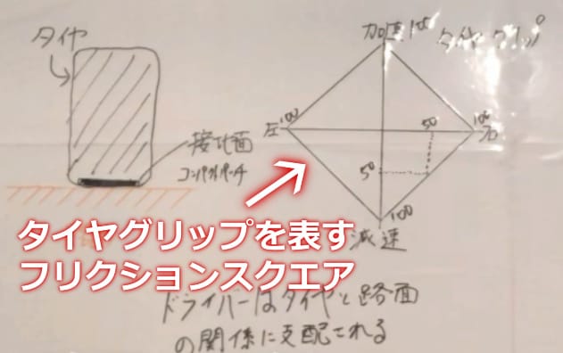 * 特に初心者、経験の浅い方は、タイヤの4輪のグリップの合計がこのフリクションスクエアに凝縮されているとイメージしましょう。荷重まで考えだすと複雑になりすぎます。