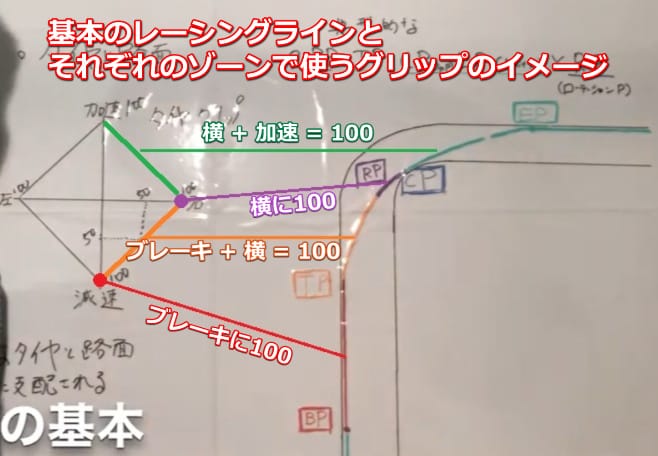 以下の画像の右側に例えの右コーナーが書かれており、そのなかに、BP(ブレーキングポイント)、TP(ターニングポイント)、RP(ローテーションポイント 向きを変えるポイント)、CP(クリッピングポイント)、EP(エグジットポイント 出口ポイント)の5個のキーポイントと